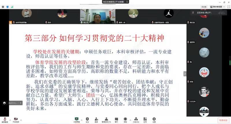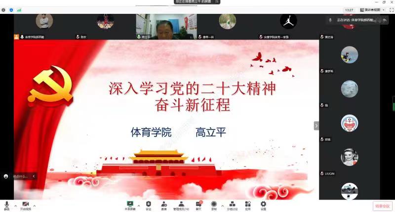 本次工会活动运用“腾讯会议”软件以线上形式开展,邀请公司党总支书记高立平同志为best365中国官方网站全体教师作了题为《深入学习党的二十大精神—奋斗新征程》的主题报告,从党的二十大召开概况;党的二十大的主要精神和如何贯彻党的二十大精神等三个方面进行了宣讲。