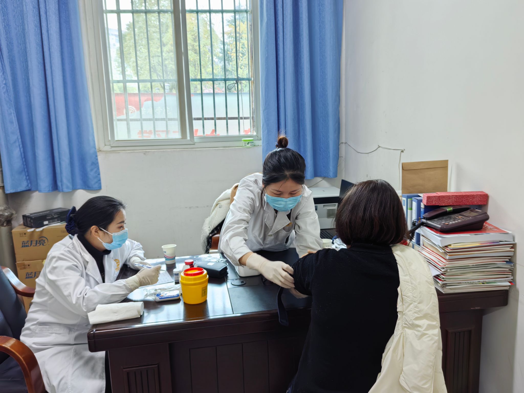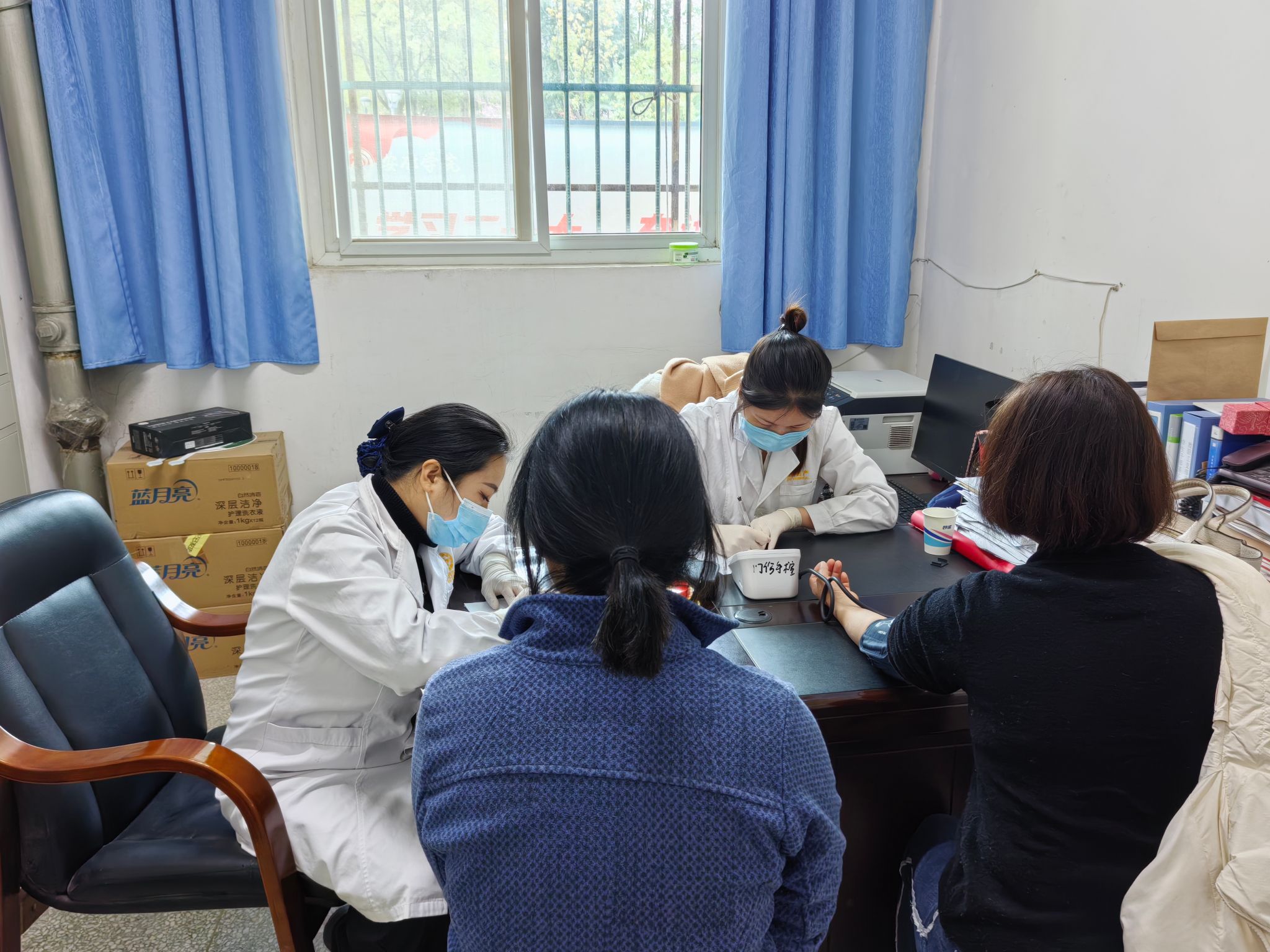 活动现场,华兴妇产医院的医护人员为前来健康体检的教师以及家属量血压、测血糖,进行腹部B超检查。提醒大家在日常生活中要保持健康的生活方式,注重疾病的预防,定期进行体检,有效避免疾病的发生。