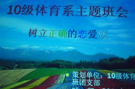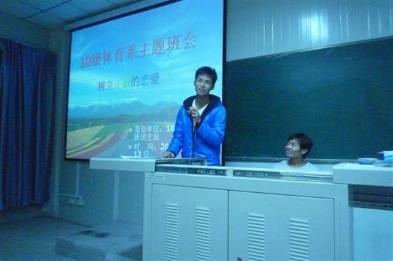 11月20日晚,体育系在10号教学楼成功举行了“树立正确的恋爱观”的主题班会,辅导员梁鸿老师和体育教育10级全体员工参加了班会。