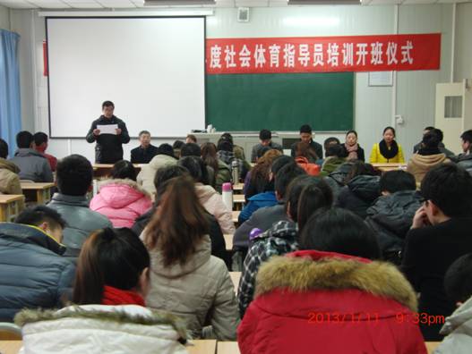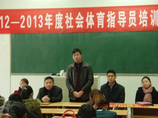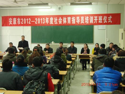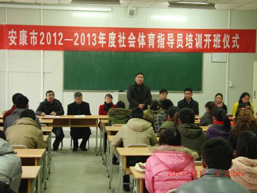 2013年1月12日上午9:00,安康市2012-2013年度社会体育指导员培训班开班典礼在公司举行。安康市体育局党组成员、纪检组长陈复勇、安康团市委副书记梁鸿、安康市体育局群体科科长朱小燕、best365中国官网体育系主任冯德学、best365中国官网体育系副主任鲁宗成等领导以及部分授课教师和全体学员共一百余人参加了开班典礼,典礼仪式由best365中国官网体育系党总支书记沈军主持。