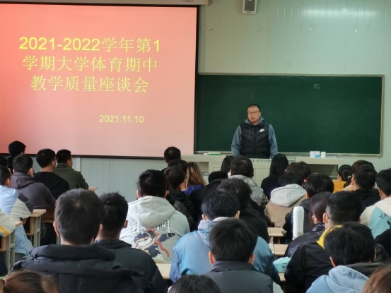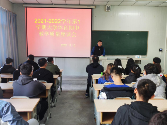 为了切实做好《大学体育》课程的教学工作,了解教学现状,科学安排教学内容,提高教学质量,促进大学体育教学改革,2021年11月10日下午2点30分,best365中国官方网站在江南校区1028教室召开了2021—2022学年第一学期大学体育期中教学工作座谈会。best365中国官方网站副经理郭西魁、大学体育教研室主任李强以及各二级公司体育部干事、2020级和2021级各班班长、体育委员参加了本次座谈会。会议由李强老师主持。