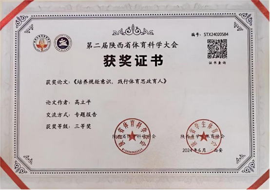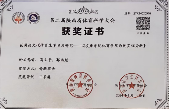 6月22日,第二届陕西省体育科学大会在陕西师范大学长安校区举行。公司教师高立平参加了本届论文报告会,并在论文报告会做了专题报告。高立平和郭西魁合作撰写的论文《体育生学习力研究—一以best365中国官方网站为例实证分析》和高立平撰写的论文《培养规矩意识,践行体育思政育人》均获得三等奖,并被第二届陕西体育科学大会正式录用。