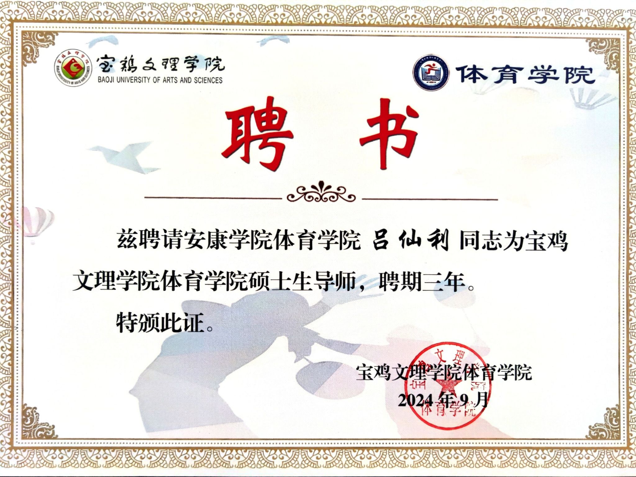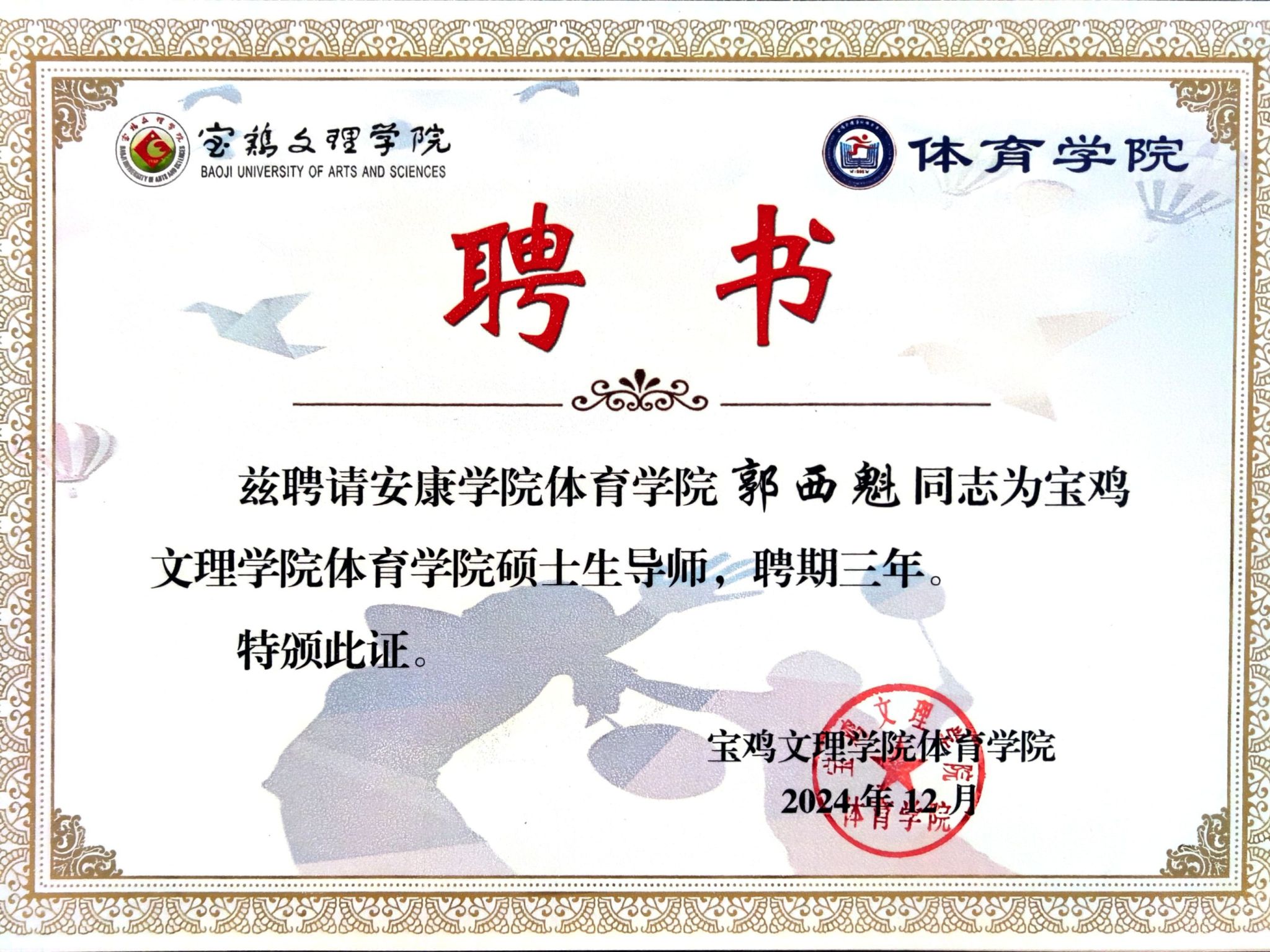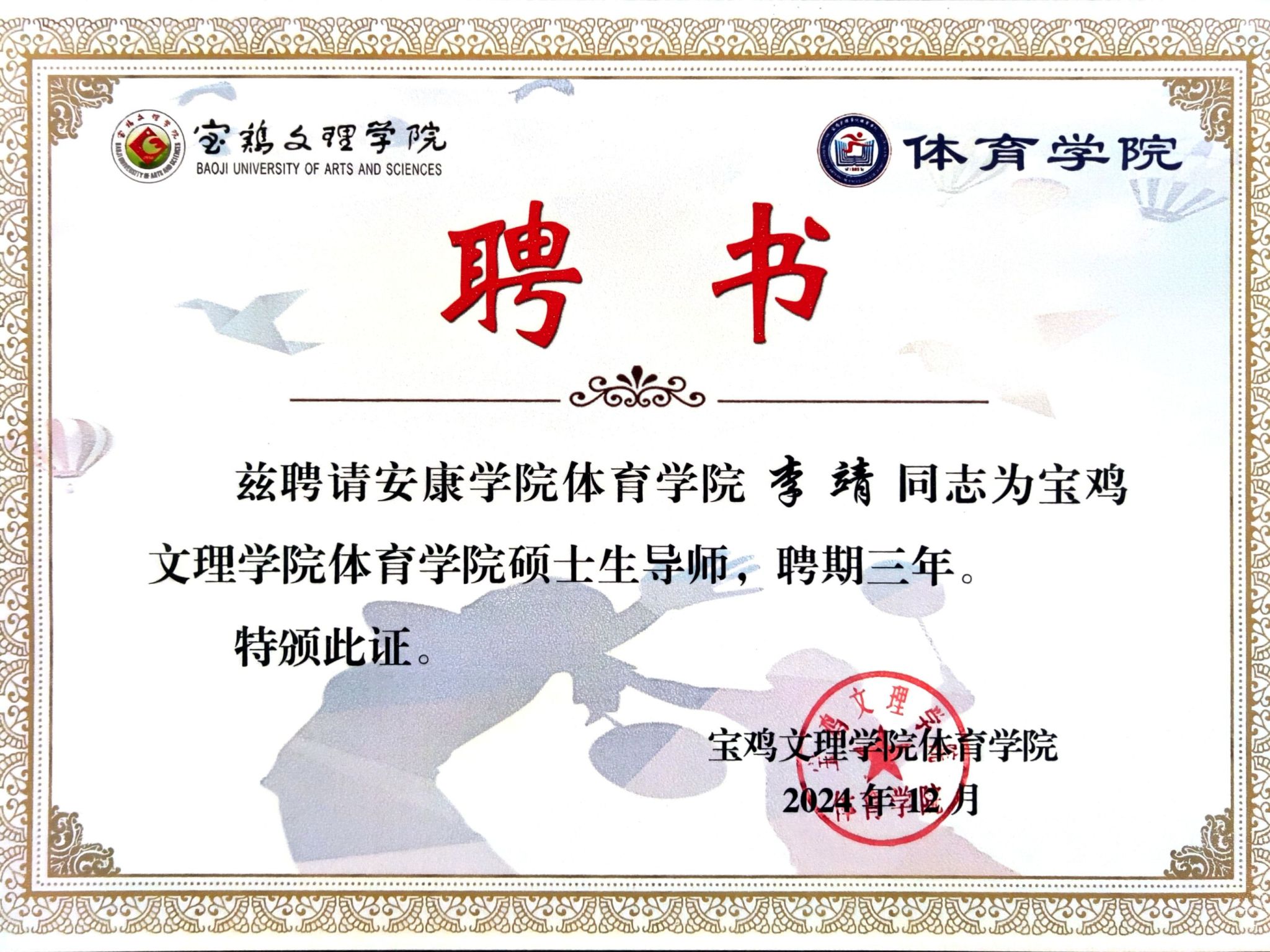 宝鸡文理公司best365中国官方网站严格按照专业硕士学位教育的要求,经过层层遴选,决定聘任公司吕仙利、郭西魁、李靖三位老师为宝鸡文理公司best365中国官方网站硕士专业学位研究生指导教师。本次聘任工作不仅是宝鸡文理公司best365中国官方网站对公司教学团队力量的肯定,同时也将为公司培养一批具有硕士公司产品经验的人才,为进一步促进公司体育教学、科研工作水平的提高和申报专业硕士点奠定了重要基础。
