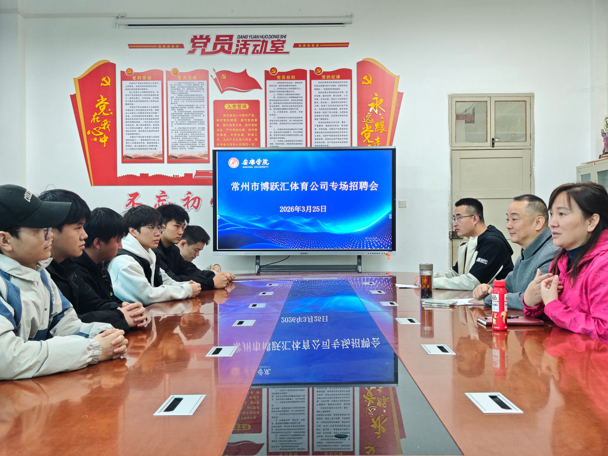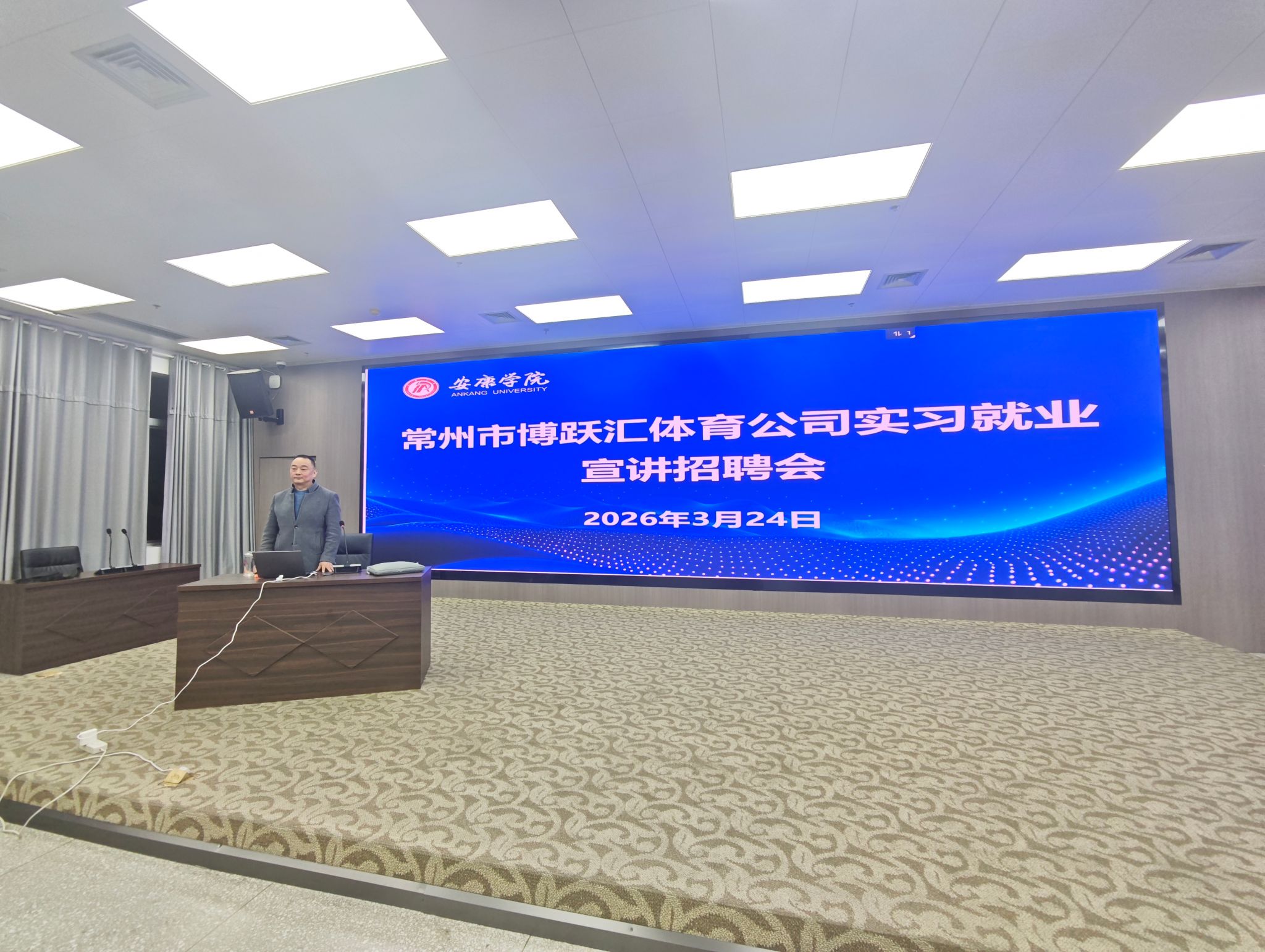 3月24日晚,常州博跃汇体育文化产业发展有限公司董事长巢旭、相关负责人黄明君一行莅临公司,面向大三、大四年级员工举办实习就业专场宣讲会。公司领导班子成员、全体辅导员和全体大三、大四同学共同参加了此次活动。