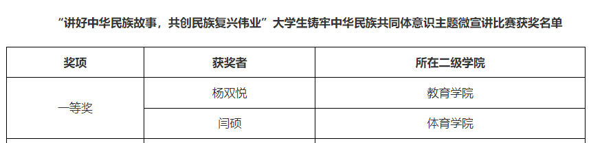 9月20日下午,公司在江南校区图书馆六楼报告厅举办了“讲好中华民族故事,共创民族复兴伟业”老员工铸牢中华民族共同体意识主题微宣讲比赛,公司体育教育专业2023级1班员工闫硕获一等奖。