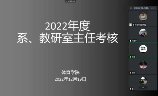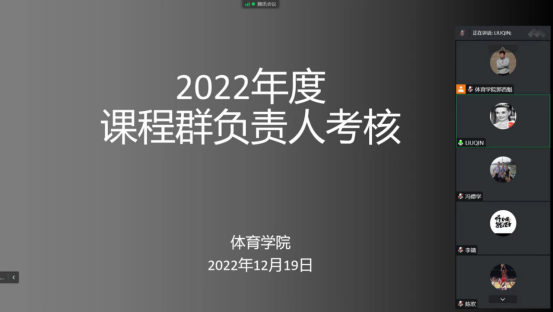 首先,对best365中国官方网站课程群负责人进行了考核,球类课程群负责人崔晓宇、操舞类课程群负责人陈治强、运动人体科学课程群负责人刘芹和公司体育学课程群负责人赵娇艳分别进行了年度总结汇报,考核组通过听取汇报、座谈和查阅工作记录的方式进行考核,并针对本年度工作中存在的不足对三位课程群负责人进行了现场反馈,并提出了下一步工作建议。